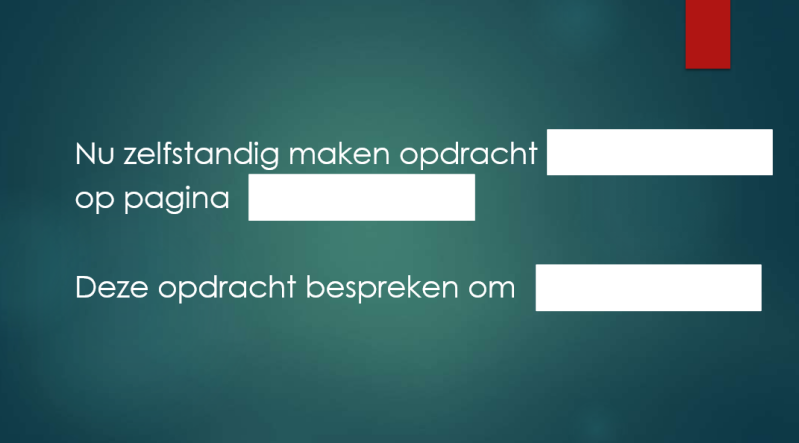 Na het bespreken van de theorie en het maken van de testopgaven kunnen de leerlingen zelfstandig aan de slag met de opdrachten uit het boek.